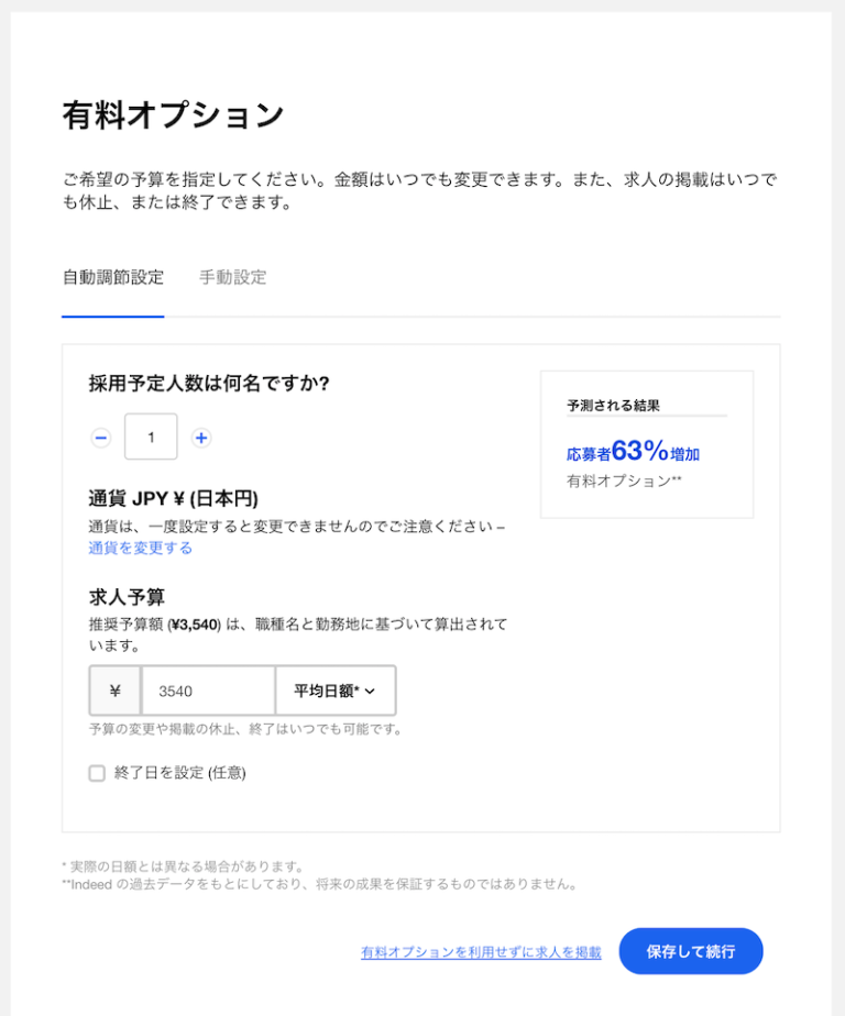 ただし、予算上限は自社で設定可能な一方、クリック単価は自社で決められず、Indeed独自のAIが自動で設定します。