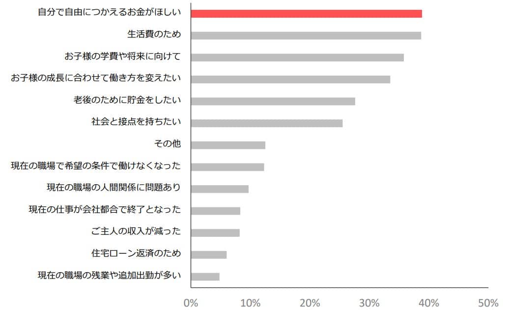 きっかけの第1位は「自分で使えるお金がほしい」、第2位は「生活費のため」、第3位は「子どもの学費や将来に向けて」でした。
