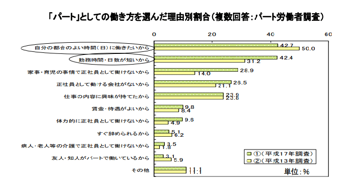 厚生労働省の調べによると、パート労働者が「パート」としての働き方を選んだ理由としては、「自分の都合のよい時間(日)に働きたいから」、「勤務時間・日数が短いから」が40%を占め、「パート」の特性を重視しています。
