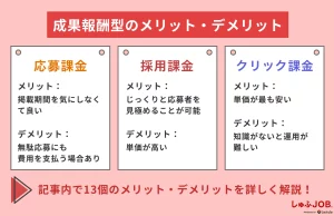 求人がクリックされたときに料金が発生する「クリック課金」、求人に応募が入ったときに料金が発生する「応募課金」、採用が決定したら料金が発生する「採用課金」があります。