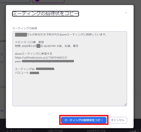 上記のようなメッセージが出るので、「ミーティングの招待状をコピー」します。