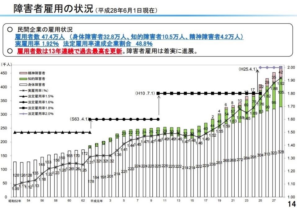 雇用されている障がい者の数は平成27年までのデータではありますが、当時15年連続で過去最高を更新していました。