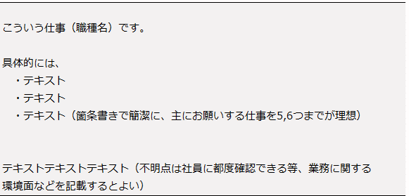 募集する現場が仕事内容を書くと、具体的に書くことができる半面、わかっている前提で書き進めてしまいがち。社内用語や専門用語ばかりが出てしまったり、省略してしまうところがでてしまうかもしれません。