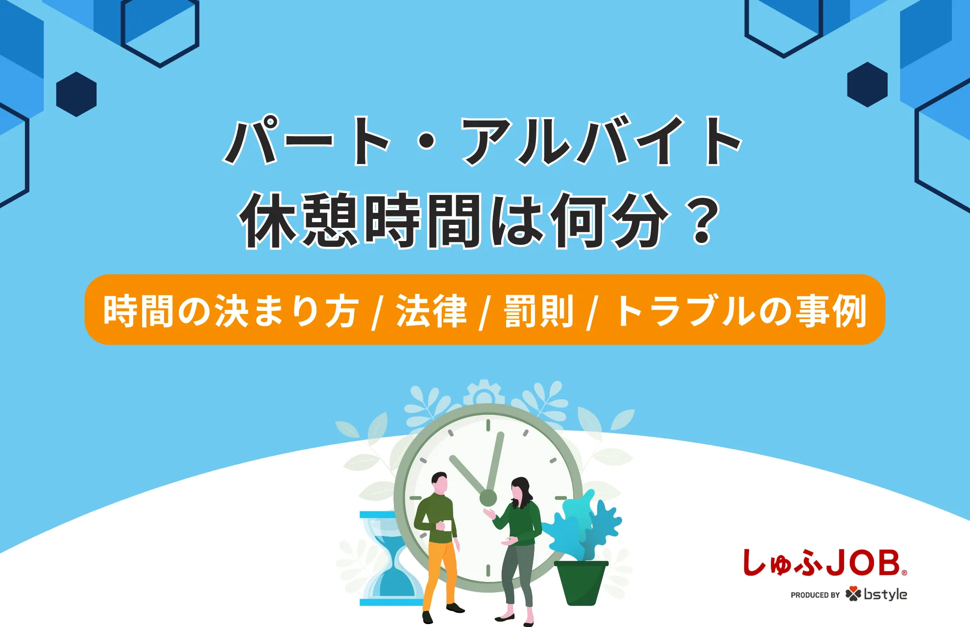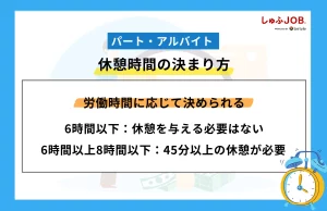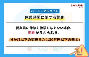 パート・正社員に関わらず、休憩時間は労働時間に応じて決められています。労働基準法によって規定されているため、違反した場合の罰則規定もあります。