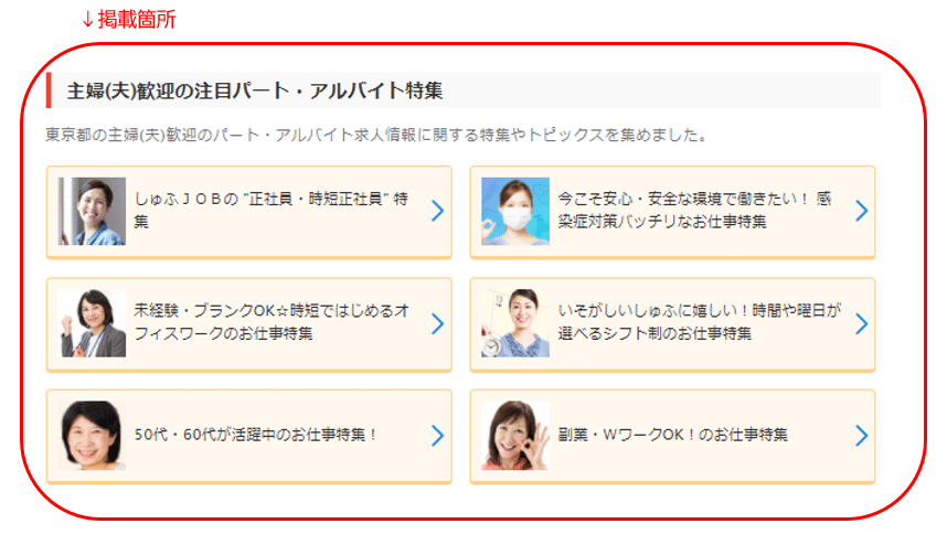 しゅふJOBのサイト上での広告は、メルマガでの広告オプションと異なり、WEB検索で求人にたどり着く人にもアピールができるという大きな強みがあります。