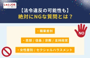 面接で絶対に避けるべき質問があります。「雇用形態問わず」すべての面接において適用され、法令違反やハラスメントになる可能性があるため、十分に注意しましょう。