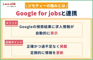 Google for jobs に自動的に表示されるため、求人情報を正確かつ過不足なく掲載することが活用のポイントです。