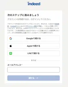 すると、以下のようなアカウント作成画面が表示されるため、会社用のメールアドレスなどIndeedに使用できるものを登録しましょう。