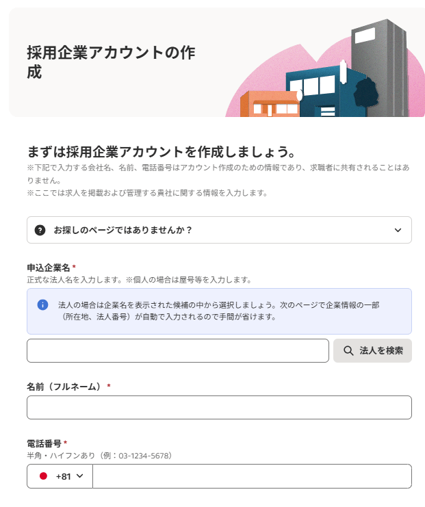 メールアドレスの登録手続きが完了すると、採用企業アカウントの設定画面に移ります。