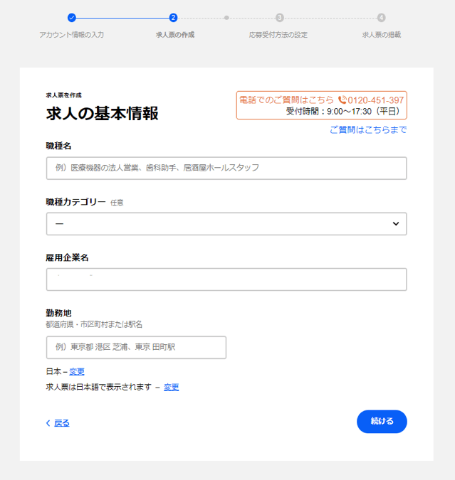 表示画面に従って入力を済ませ、求人票の設定に進みましょう。求人票の設定も職種名や求人キャッチコピーなど、表示される項目に沿って入力すれば問題ありません。