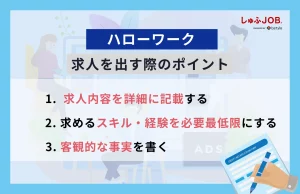 スキルや経験を限定しすぎてしまうと、掲載期間内に応募者が現れない可能性が高くなってしまいます。ハローワークを利用する場合、期限内でいかに求職者と巡り会えるかは重要な事柄となります。