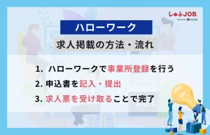 それでは実際にハローワークに求人掲載するまでの流れを確認していきましょう。流れは大まかに以下の4ステップに分けられます。