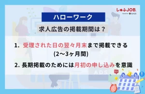 ハローワークの掲載期間は掲載開始日から翌々月の月末までと決まっています。しかし、掲載開始のタイミングによっては、掲載期間が3ヶ月になるケースと2ヶ月になってしまうケースがあります。