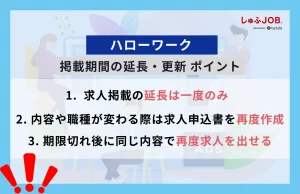 ハローワークの求人掲載期間を延長・更新する上で押さえておきたいポイントは以下の3つです。