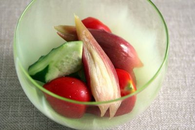 ミョウガは甘酢に漬けると自然にピンクの可愛い色味になります。お子様にはミニトマトやキュウリのほかに、さっと茹でたパプリカや、ニンジン、カブなども食べやすくてオススメです。