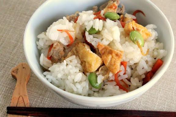 6、炊けたご飯に炒めた具・枝豆を加えてよく混ぜる。