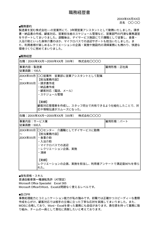 では、実際に書き方を確認していきましょう!まず、職務経歴書のサンプルをご紹介します。