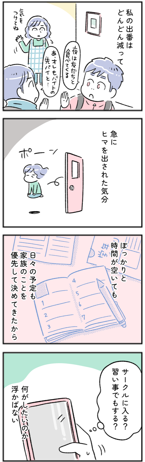 息子2人の成長とともに、ふと生まれた自分の時間。これから何をすればいいのか、このままでいいのかもわからないーーー 50歳、人生の節目にめぐみが描く「これからの人生」とは? ”生きづまる”私たち、いよいよ最終話です!