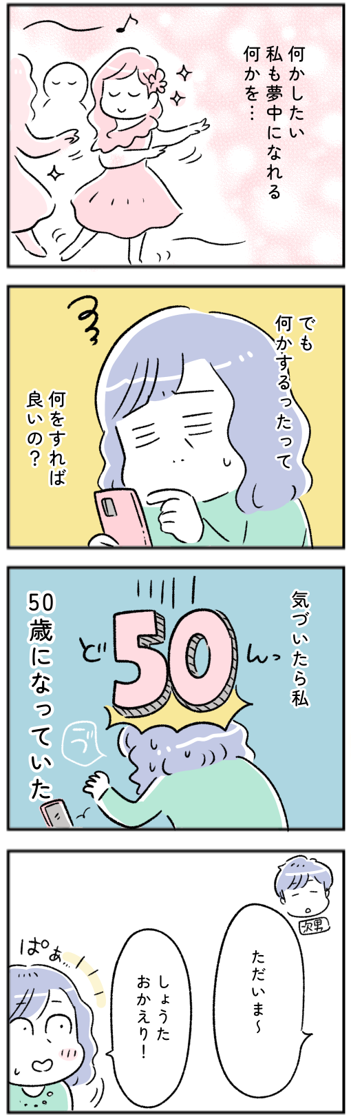 息子2人の成長とともに、ふと生まれた自分の時間。これから何をすればいいのか、このままでいいのかもわからないーーー 50歳、人生の節目にめぐみが描く「これからの人生」とは? ”生きづまる”私たち、いよいよ最終話です!