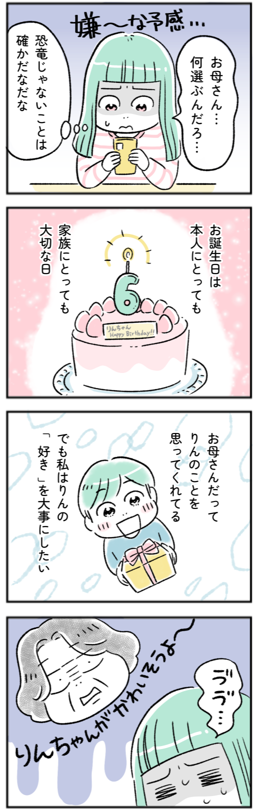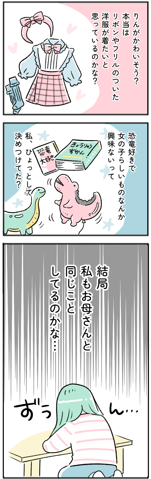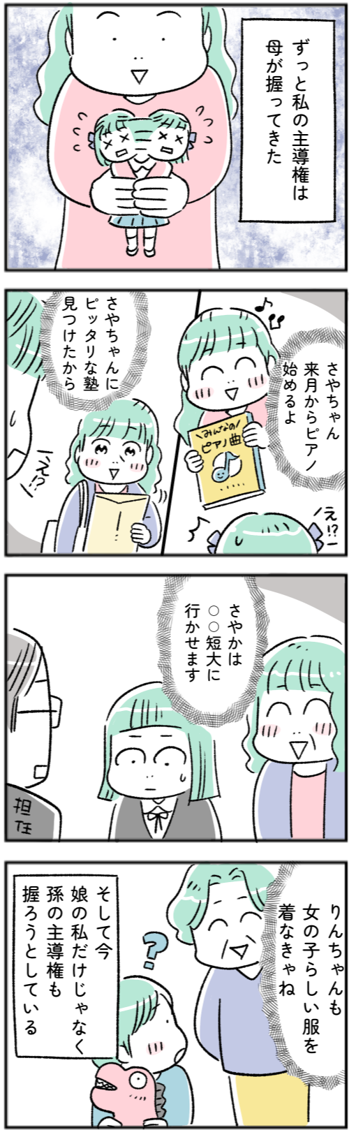「私は母のようにはならない」と心に決めたのにー ちょっと個性的な5歳の女の子・りんの母、さやか33歳。 ”娘の感性や好きなものは決して否定せず、尊重する"が子育てのモットー。 その信念の背後には、さやか自身が実母から受けた言葉の数々が、今も消えない影を落としている。 自分が育てられた価値観と、娘に育てたい価値観のはざまで。 りんの誕生日プレゼントをきっかけに、さやかの胸の奥底にくすぶっていた感情のフタが開いていく…