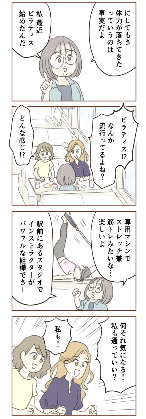 気力も体力も落ち気味な三人は、なぜかピラティスに通うことに。