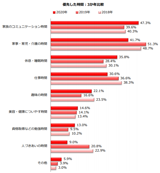 2018年~2020年に行ったアンケート結果を比較してみると、働く主婦が優先したい時間が移り変わっている様子が見られます。