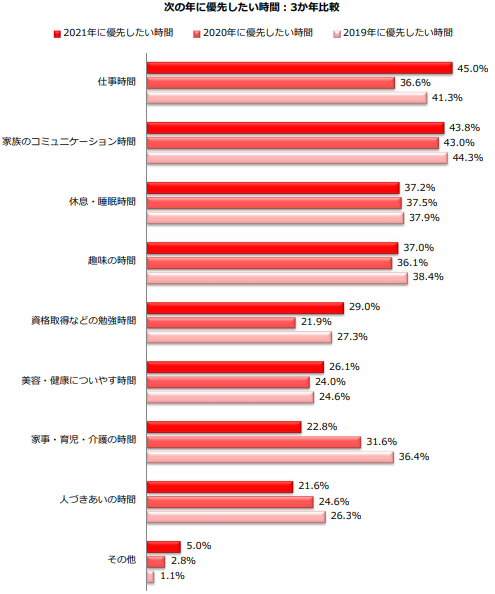 逆に、「2021年に優先したい時間」の方が顕著に少ないのは「家事・育児・介護の時間」です。「優先した時間」の直近3か年の推移を⾒ると2020年の「家事・育児・介護の時間」は最小の数値となっています。