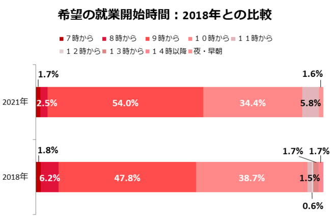 就業開始希望時間について、2018年・2021年ともに9時からが最も回答が多く、次いで10時からとなっています。