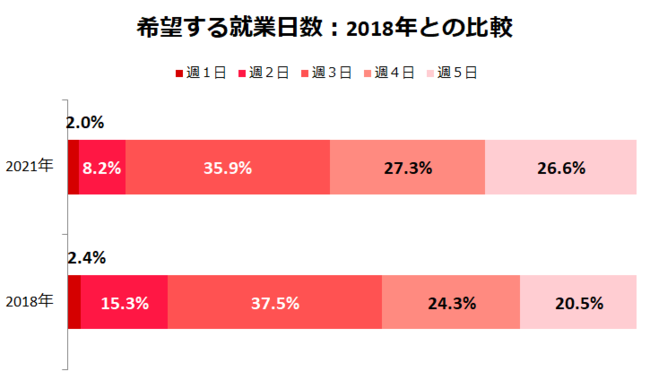 比率の増減で見ると、週1~3日の勤務を希望する割合が減り、週4~5日勤務を希望する割合が増加しています。