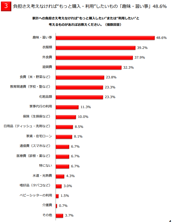 支出で負担に感じているものの1位は「教育関連費」、家計への負担さえ考えなければ“もっと購入したい”または“利用したい”と考えるものの1位
