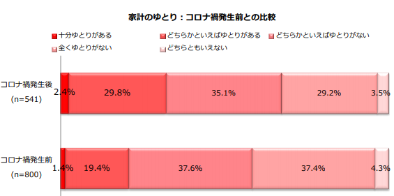 コロナ発生前後で比較して、ゆとりがある(十分ゆとりがある/どちらかといえばゆとりがある)と回答した人の比率は増えています。