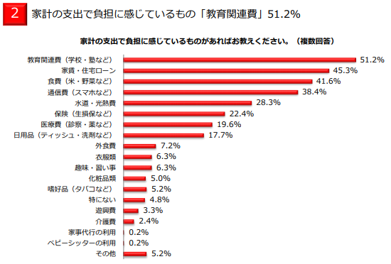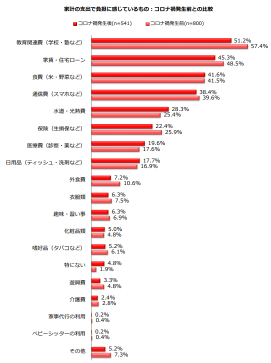 家計の支出で負担に感じているもの、第1位は「教育関連費」!という結果に。コロナ禍前のアンケートとも比較してみましょう。