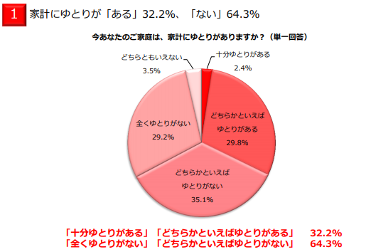 「今あなたのご家庭は、家計にゆとりがありますか」と質問したところ6割以上の人が「ゆとりがない」と回答しました。