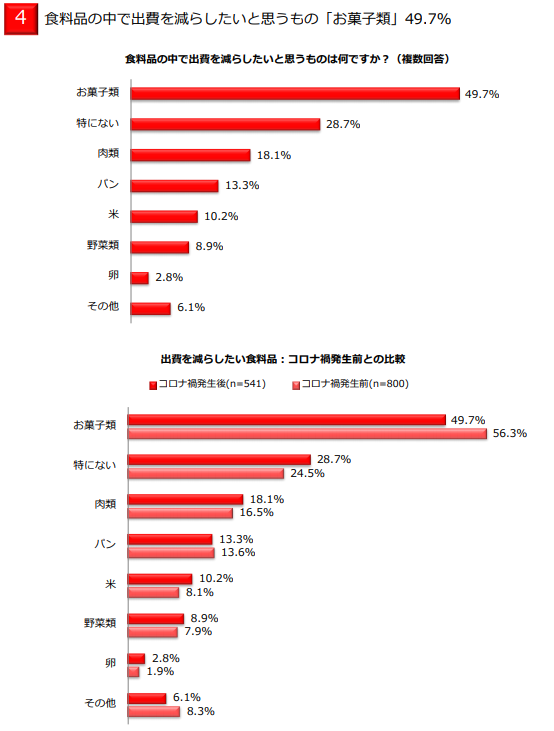 また、出費を減らしたい食料品の1位は「お菓子類」、日用品の1位は「特になし」です。