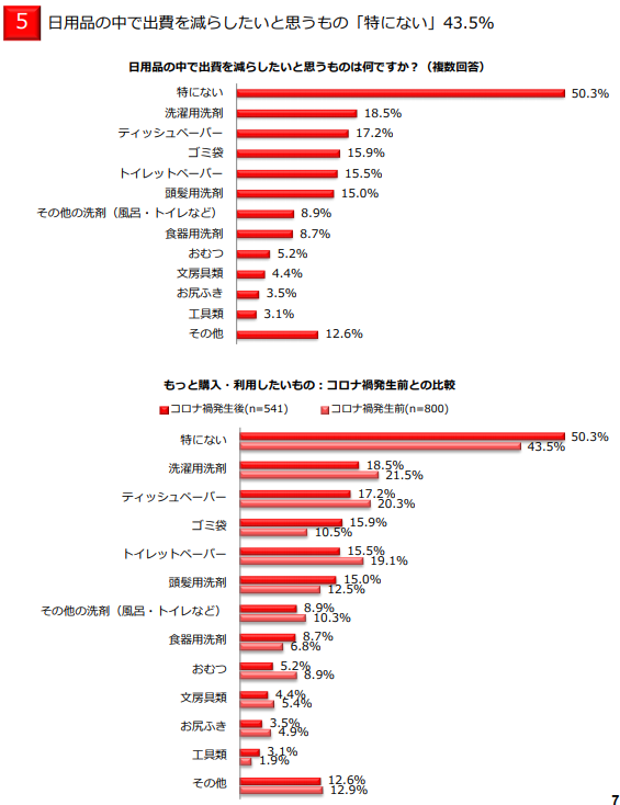 コロナ禍前には、洗濯用洗剤、ティッシュペーパー、トイレットペーパーへの出費をもう少し減らしたい…と考えていた方が比較的多かったようです。
