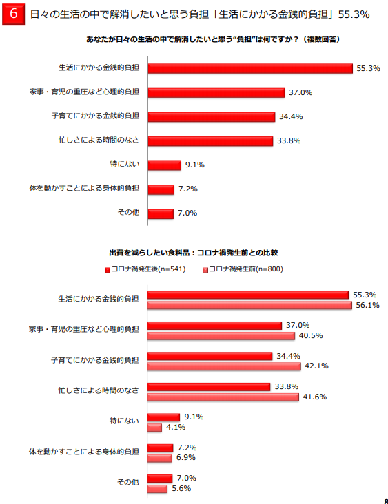「あなたが日々の生活の中で解消したいと思う負担は何ですか?」という問いに対して最も回答が集まったのは、生活にかかる金銭的負担でした。