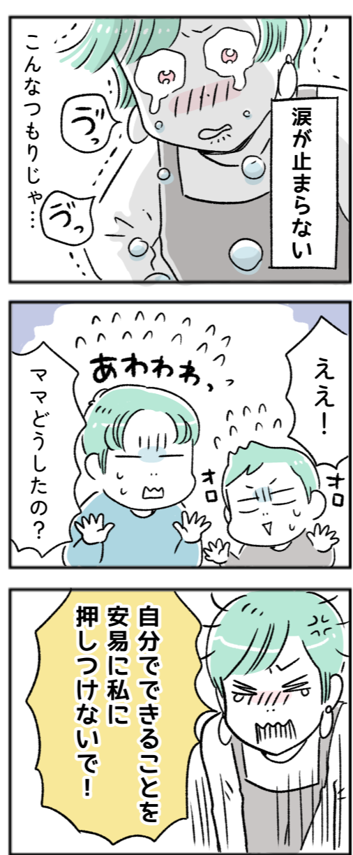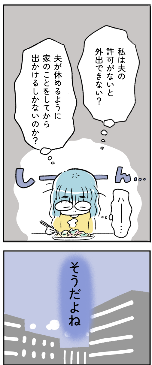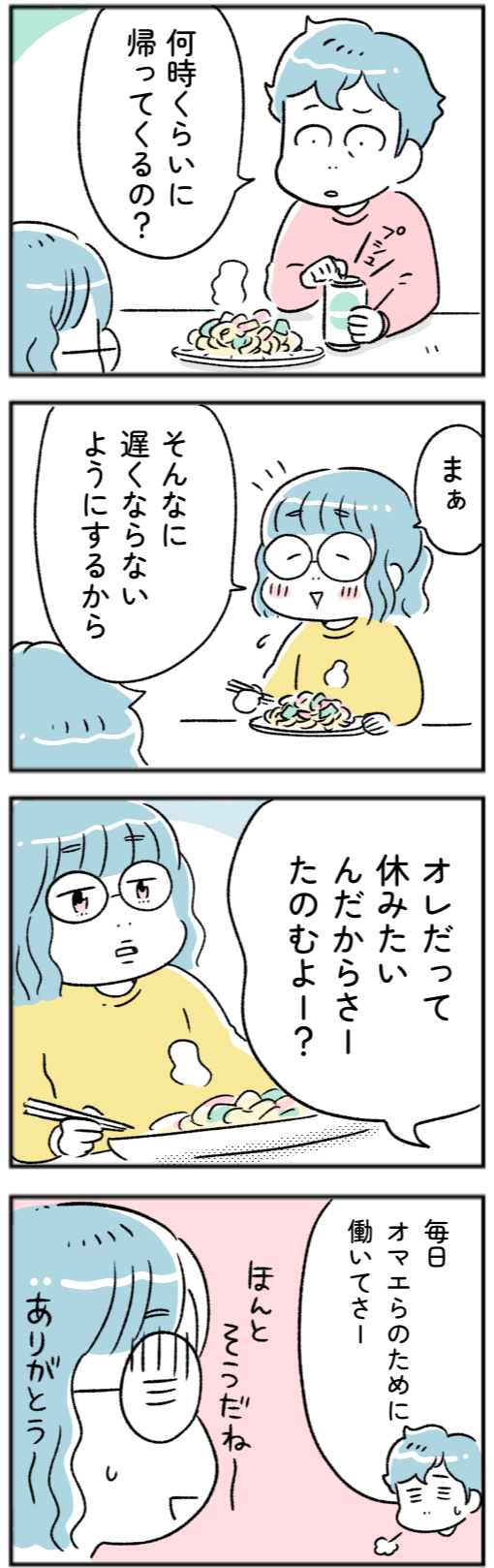 このシーン、妻が「その日はお弁当を買うとか、自分でなんとかしてもらえないかな。」とか言い返していいだろう、と僕は思うんです。でもこの主人公のように「そうだよね」と自身で抱えこんでしまう現実は多いはずです。