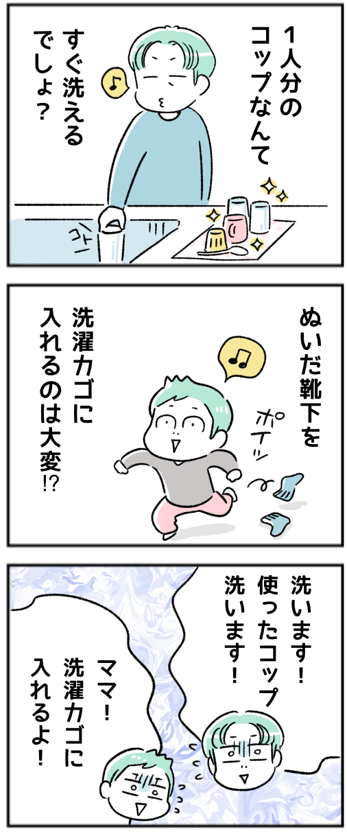 靴下は、脱いだ人が洗濯機に入れるもの。僕は子どもに「お茶~」と言われて「お茶?お茶がどうしたの。お茶は飲みたい人が自分で淹れるもの。つまりキミの仕事だ」とたしなめたことがあります。