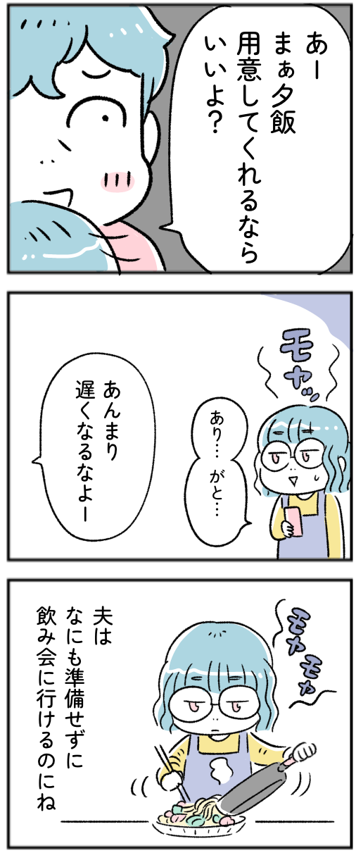 そうですね、意識や思い込みは大きな問題で、女性側が「自分がやらなければ」と背負いこんでしまっているケースもありそうです。例えば、第3話に「飲み会に行きたい」という妻に、夫が「いいよ、夕飯用意してくれるなら」と発言する一コマがありました。