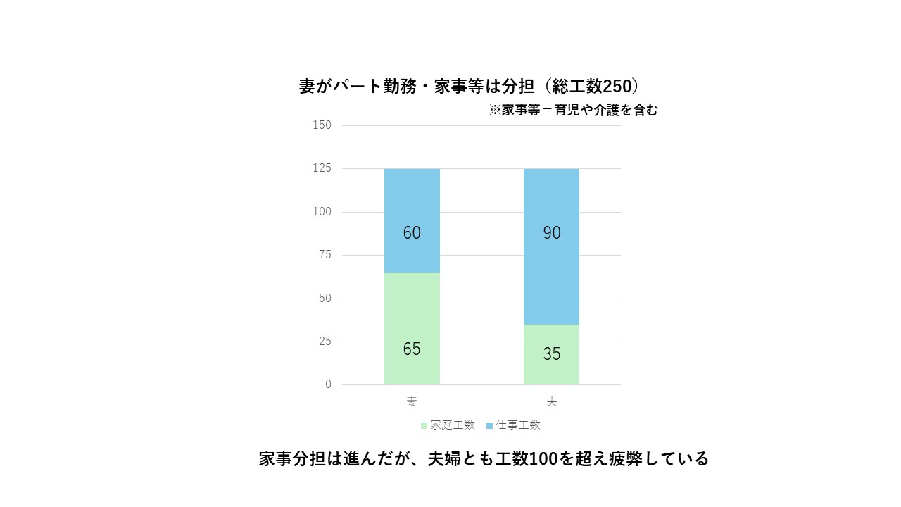 250の工数を夫婦で分担して125・125にするのか、そもそも250の全体量を見直し減らすのか。これを行わない限り、働きづらさや家庭内のひずみは解消できないはずです。