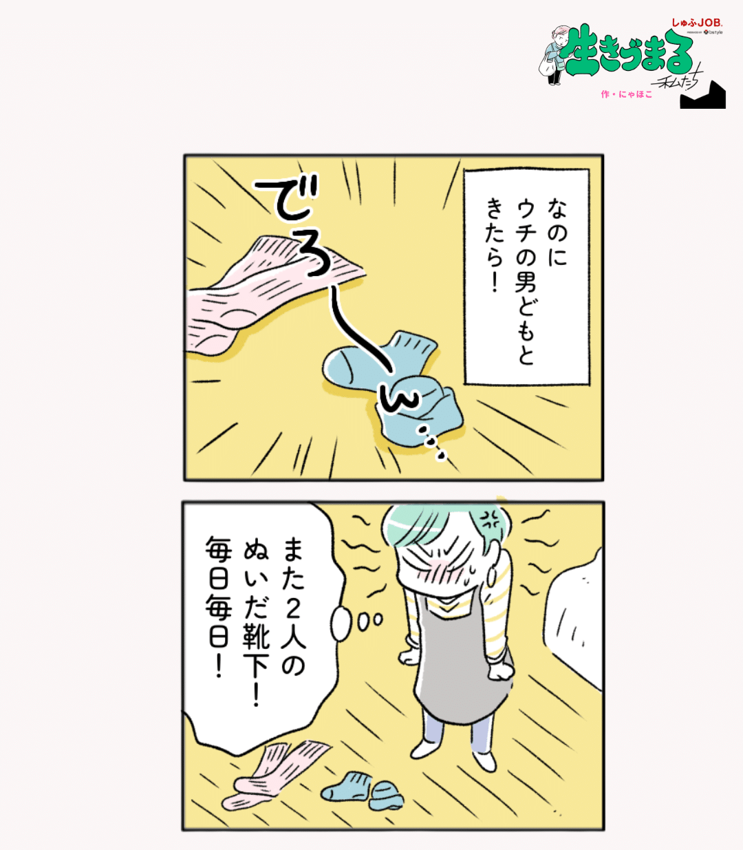 例えば2話目のこのシーン。わたし自身、主夫5年目。脱ぎっぱなしの靴下を目の当たりにした時のがっかり感、ある種の“諦め半分”な日常。“あるある”とも言えますが、この奥に潜む課題は根深いです。