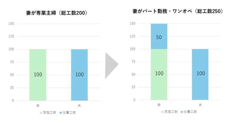 共働きが増えた近年、家事は楽になっていないのに仕事が上乗せされている。例えばパートで働く工数を50とすると、女性の工数は150になる。全体工数が250に増えていると言えます。フルタイム共働きであればさらに増えますね。
