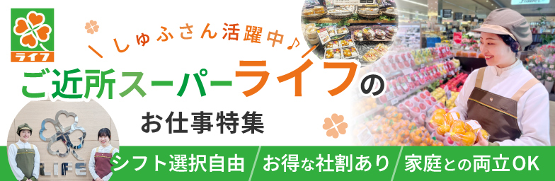ご近所スーパー「ライフ」のお仕事特集!お買い物社割あり★シフト選択自由★しゅふさん多数活躍中